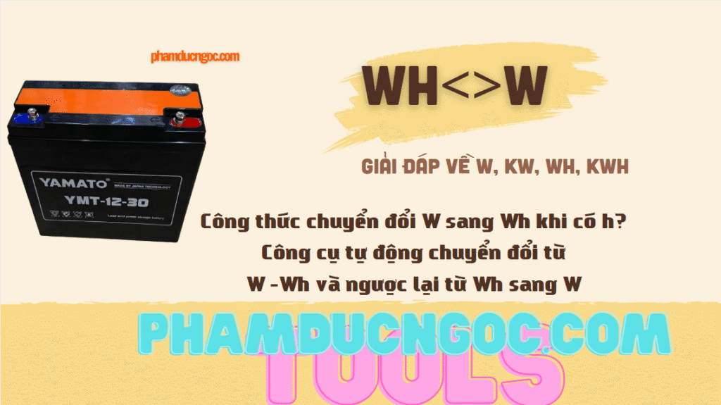 Trước đây, thời kì đầu thì mình hay sử dụng công thức để tính. “Công suất (W) = Năng lượng (Wh) ÷ Thời gian (h)” như đã giới thiệu ngay ở dưới mỗi công cụ ở phía trên, và ở phía trên ý, mình có cả hai bộ công cụ luôn là W sang Wh và Wh sang W để anh em tiện sử dụng. Về sau mình sử dụng công cụ do bên Alex làm, công cụ của họ cũng khá ổn, nhưng muốn tìm thực sự khó quá, thay vì đó sau này mình muốn tìm công cụ ví dụ như tính chuyển từ Wh sang W thì vào website, mình sẽ làm menu các công cụ tính toán nhanh đỡ mất thời gian hoặc tìm kiếm “Wh sang W Phamducngoc.com” là ra luôn kết quả, vào sử dụng thôi.