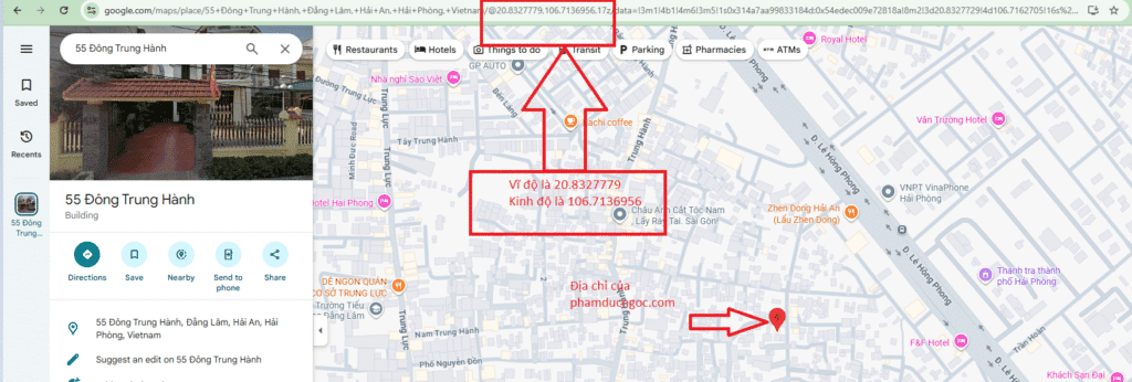 https://www.google.com/maps/place/55+%C4%90%C3%B4ng+Trung+H%C3%A0nh,+%C4%90%E1%BA%B1ng+L%C3%A2m,+H%E1%BA%A3i+An,+H%E1%BA%A3i+Ph%C3%B2ng,+Vietnam/@20.8327779,106.7136956,17z/data=!3m1!4b1!4m6!3m5!1s0x314a7aa99833184d:0x54edec009e72818a!8m2!3d20.8327729!4d106.7162705!16s%2Fg%2F11svqfmtj0?entry=ttu&g_ep=EgoyMDI1MDkyMi4wIKXMDSoASAFQAw%3D%3DBước 3: Vầy chúng ta có vĩ độ là khoảng 20.8o > nó cũng gần như là chính xác so với toàn bộ khu vực Hải Phòng.