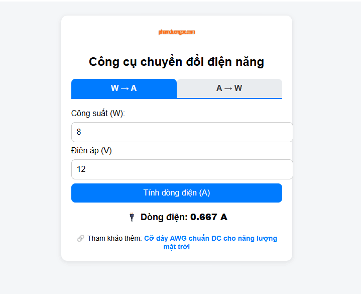 Bước 1: Sử dụng [Tools] Công cụ chuyển đổi từ Watt (W) sang Ampe (A) > tính 12V8W thì chúng ta sẽ được là 0.6A