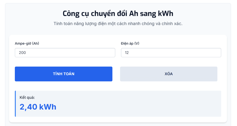 Thông qua Công cụ tính tự động Ah sang kWh thì mình cũng tính ra được khoảng 2.4 số điện ( tương đương là 2,40 kWh )