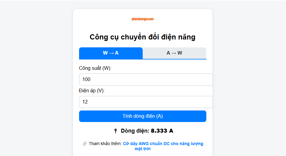 Trong lúc làm việc với nội dung ” Cỡ dây AWG chuẩn DC cho năng lượng mặt trời ” thì cần chuyển đổi chung các thiết bị điện từ W sang A để chuẩn hóa dữ liệu, đây là một bước khá nhỏ mà nếu tính nhẩm tốt bạn hoàn toàn có thể tự tính được. Nhưng để chắc chắn hơn, ổn hơn hẳn thì mình đã chính thức tạo ra một công cụ chuyển đổi từ Watt (W) sang Ampe (A)